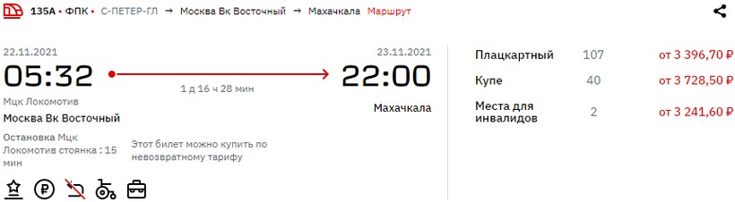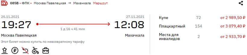 Поездка на утреннем скором составе дороже, чем на вечерних № 085В и № 133М. Если ж/д билеты купить на поезд Москва — Махачкала № 135А за 90 дней до даты путешествия, стоимость составит: