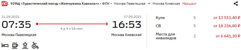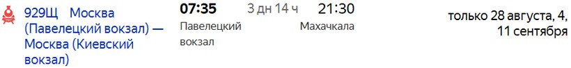 Для туристов, которые захотят отправиться в столицу Дагестана на составе № 929Щ (прибытие на махачкалинский железнодорожный вокзала через 86 часов после отправления), придется купить билет на весь маршрут Москва Павелецкая — Москва Киевская. В составе все вагоны повышенной комфортности, поэтому проездные дорогие: