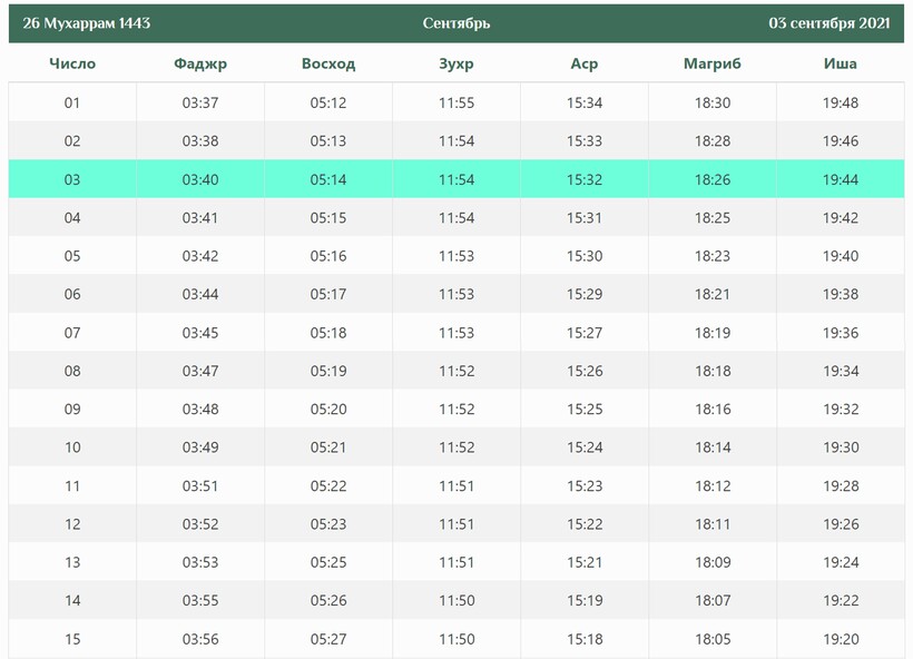 Таблицу на текущий месяц, в которой на каждый день расписано время намаза в Махачкале в Джума-мечети, центральной в городе, можно найти на ее официальном сайте.