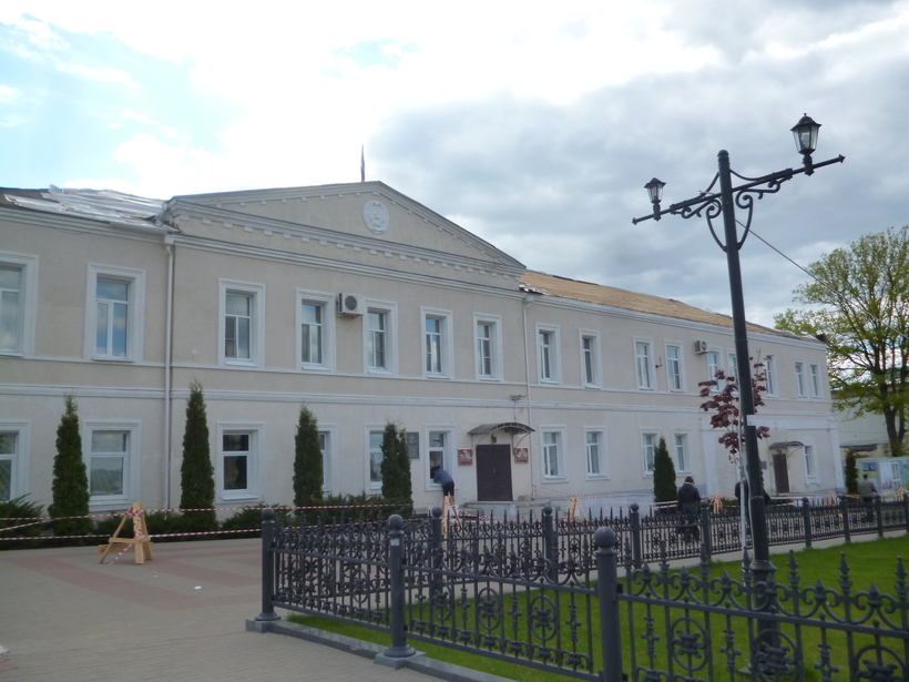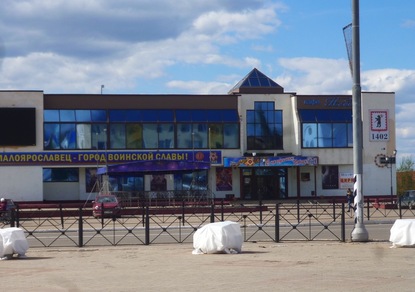 Между этими памятниками обратите внимание на двухэтажное здание. Сейчас это здание администрации Малоярославецкого района и городской архив, а примечательно оно тем, что построенное в 1810 году, оно является свидетелем Малоярославецкого сражения.
