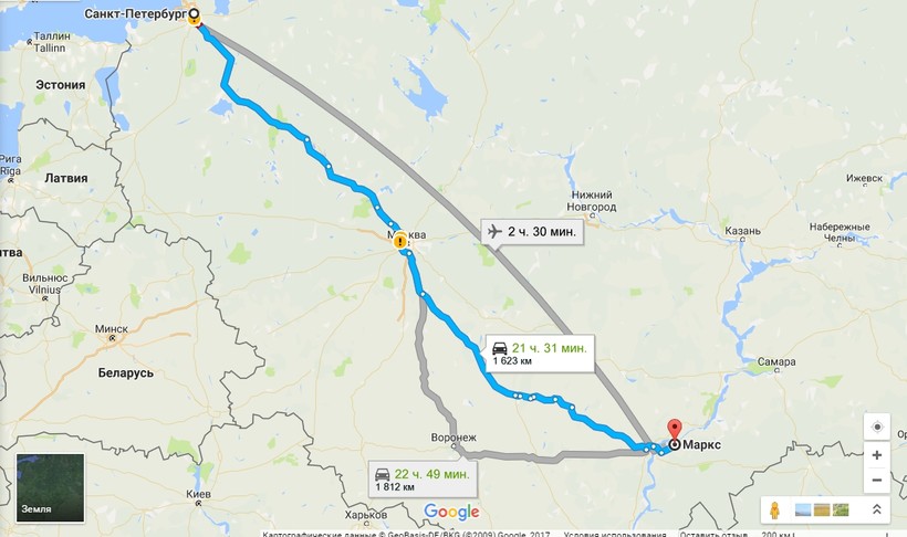 Санкт-Петербург и Маркс разделяют 1622 километра, которые на машине можно проехать примерно за 21 час. Гостям из Северной столицы нужно будет доехать сначала доехать до Москвы по трассам Е-105 и М-10, а оттуда добраться до саратовского города по описанному выше маршруту. На такую поездку уйдёт около 6100 рублей.