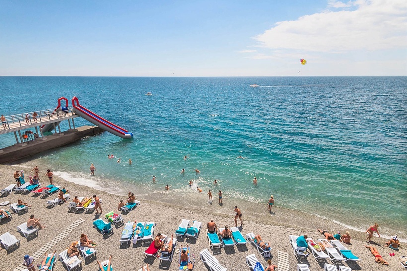 - Пляж гостиницы «Ялта-Интурист». До него тоже надо добираться через Массандровский парк. Выходите из парка и сворачивайте налево. За парковкой есть лестница, ведущая к пляжу. Для тех, кто не живёт в гостинице, пляж платный. Раньше стоимость была невысокой – где-то 200 рублей, но «Интурист» постоянно меняет условия посещения своей территории, так что могут быть и изменения. На пляже есть отличные рестораны и кафе. Фьюжн кафе «Апельсин», например. Мне этот пляж нравится: удобно заходить в воду с берега или скатываться на надувной горке. Пляж галечный и чистый – одно удовольствие купаться и загорать.
