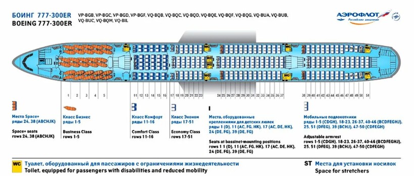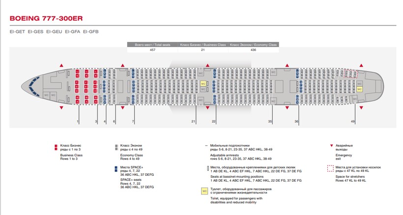 Экономкласс в «Боингах» 777-300ER авиакомпания «Россия» разделен на 3 части. Схема посадки пассажиров в каждом: 3+4+3. Отсчет начинается с 4-го ряда и заканчивается 49-м. Самые комфортные места Spase+ в рядах №№ 4, 22, 36 (A, B, C и H, K, L). Они расположены рядом с эвакуационными выходами, есть место, чтобы вытянуть ноги. Сидящие на центральных креслах на тех же рядах (D, E, F, G) лишены такой возможности. Перед ними перегородка — зато им не будут мешать разложенные спинки кресел передних пассажиров. Ближайшие к выходу ряды — №№ 6 и 7. Креплениями для детских люлек оборудованы: