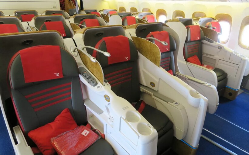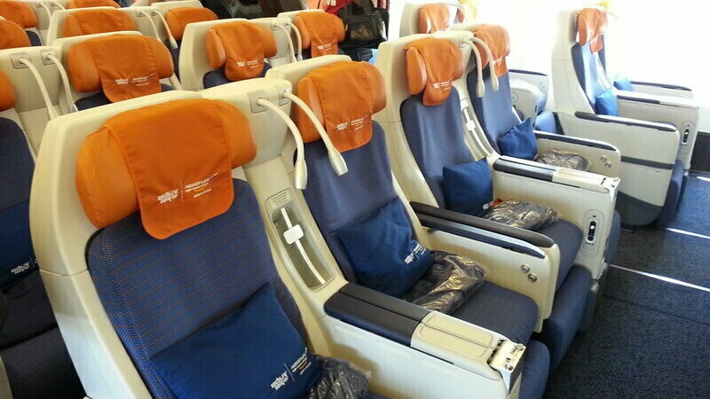 Для пассажиров бизнес-класса есть отдельный выход, кухня и туалетная комната. Самым удобным считается второй ряд — он расположен далеко от бытовых помещений. Места A и K находятся около иллюминаторов, места D — посередине салона. Если у пассажира нет необходимости смотреть в окно в полете, то размещение на креслах D не станет большой проблемой.