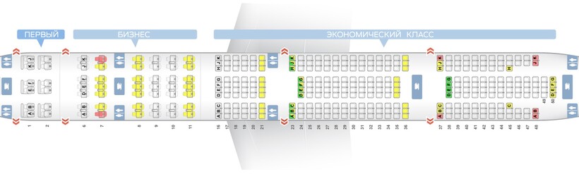 - Места с увеличенным пространством впереди — A, B, C, D, E, F, G, H, J, K в рядах №№ 1, 9, 25, 39; D, E, F, G, в 40-м ряду. Близко к туалетам и кухням.