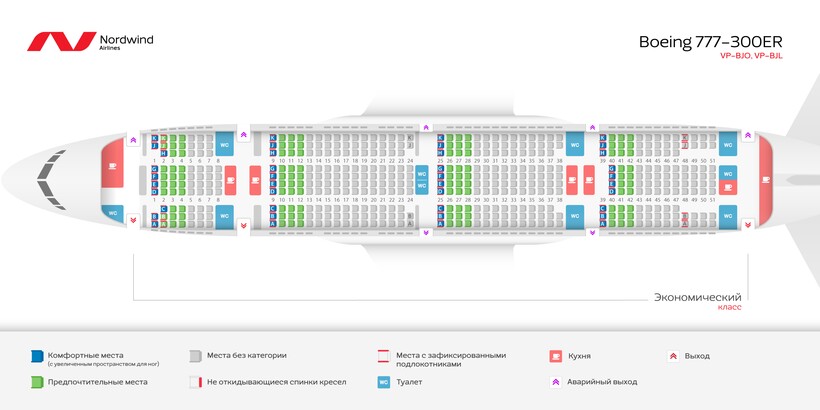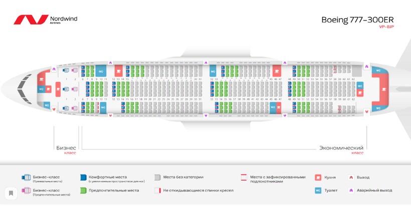 Бизнес-класс в «Боинге» 777-300ER авиакомпании «Нордвинд» есть только в самолете с регистрационным номером VP-BJP. Зона повышенной комфортности состоит из 6 мест. Традиционно они располагаются ближе к кабине экипажа.