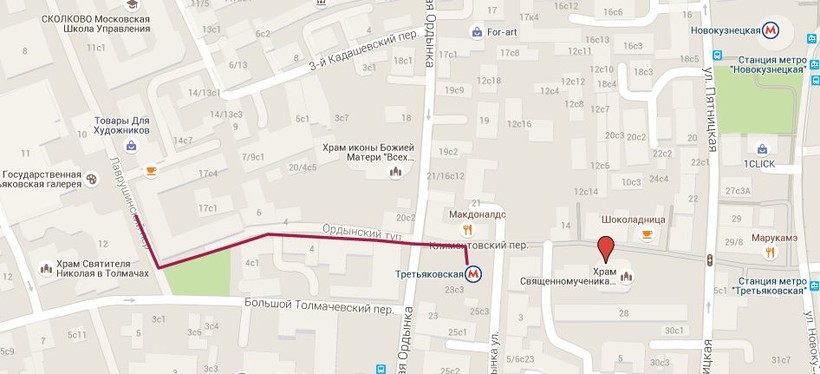 Но вернемся к Ларушинскому переулку. Для того, чтобы найти его, вам нужно, выйдя из метро на площадь, повернуться спиной к храму Св. Климента (эту большую церковь красного цвета вы увидите сразу, как выйдете из метро, она будет справа), перейти Большую Ордынку, и вы попадете в Ордынский тупик. Не пугайтесь, это только название, тупика уже давно нет. Пройдя насквозь, вы заметите небольшой скверик с фонтаном, а миновав и его, вы как раз попадете на Лаврушинский переулок. Итак, можно начать нашу небольшую экскурсию.