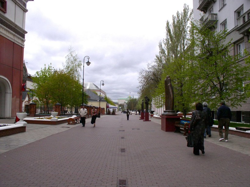 Очень красиво здесь бывает летом! Это одно из самых зеленых мест в центре Москвы. Деревья и кусты стоят так плотно, что иногда не видно зданий. Справа вдоль всей улицы протянулся широкий газон, вдоль которого выставлены лавочки.