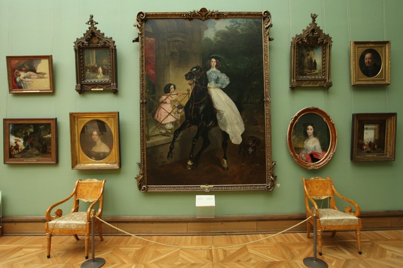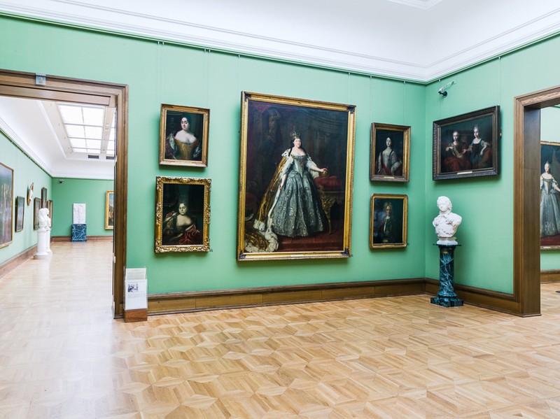 В первых залах Третьяковской галереи в Лаврушинском переулке представлены портреты, созданные художниками XIX века. В зале № 1 с портретов на нас смотрят русские цари и царицы, их наследники и представители знати. Но уже в следующей комнате появляется разнообразие: на портретах изображены простые люди (например, «Портрет неизвестной в русском костюме» работы И.П. Аргунова), появляются и игровые полотна на сюжеты из русской истории и античной мифологии.