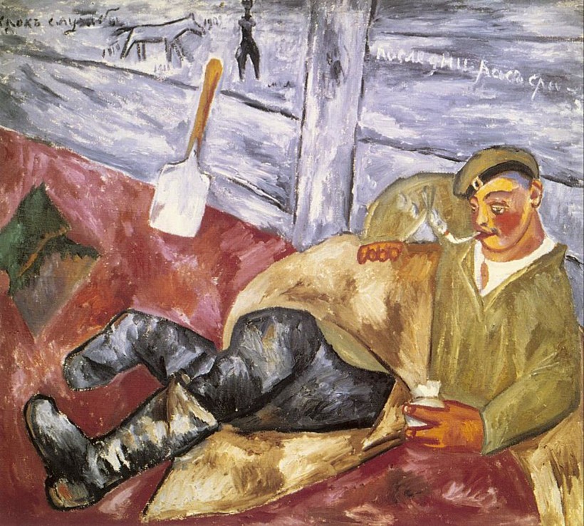 Игра со смыслами и формами, намеренный уход от реализма и поиск иных, более простых способов выражения сложных философских идей, типичны для всего искусства XX века. Интересное выражение она получает в работах М.Ф. Ларионова. На картине «Отдыхающий солдат» (зал № 1, на фото ниже) мы видим, казалось бы, знакомую портретную позу — так писали художники Возрождения отдыхающих Венер, однако здесь художник намеренно смешивает высокое и низкое, оперируя контрастами и выражая свое отношение к социальному неравенству общества.