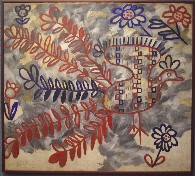 Ещё одно популярное направление живописи тех лет представлено картинами Н.С. Гончаровой — кажется, что ее натюрморты или «Павлин» (залы № 1-2) нарисованы пятилетним ребенком, но за кажущейся простотой, примитивизмом, сложные ассоциативные связи.