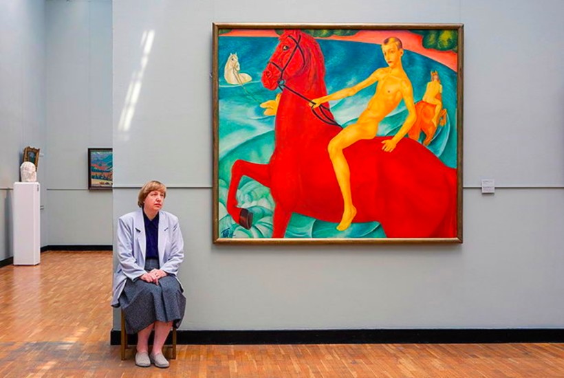 Картины К.С. Петрова-Водкина (зал № 13) пронизаны символизмом. Так, нельзя не остановиться возле его полотна «Купание красного коня» — пожалуй, самого знаменитого произведения художника. Никогда не интересовавшее меня в репродукциях, в оригинале оно почему-то заставляет меня остановиться и всмотреться в происходящее. Лицо мальчика, его поза, фигура самого коня — кажется, все наполнено здесь глубоким символическим смыслом: это и об искуплении грехов, и о духовной чистоте, и о новом, рождающемся революционном искусстве.