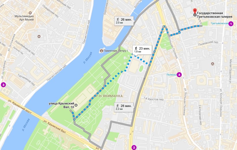 Между зданиями Третьяковской галереи можно пройти и пешком — расстояние около 2 километров вы преодолеете за полчаса. Самый простой и живописный вариант — вдоль набережной. Вы сможете полюбоваться панорамой города, а также прогуляться по парку Музеону и осмотреть забавные скульптуры, выставленные там. Если же хотите посмотреть на историко-культурные здания, то отправляйтесь через улицу Якиманка с бесплатным гидом, разработанным галерей и приложением izi.travel. Кстати, на этом же сайте можно скачать и тур по обеим зданиям Третьяковской галереи.