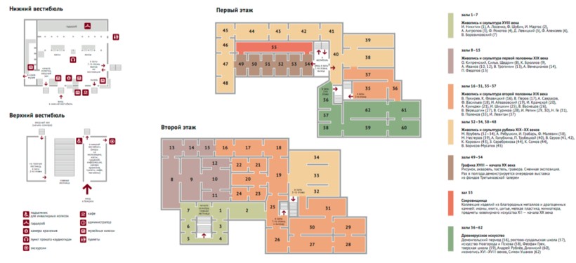 Попав в верхний вестибюль, вы можете сразу отправляться в вводный зал и на второй этаж, где находятся первые залы, если вы уже приобрели билет в Третьяковскую галерею в интернете. Если же вы предпочитаете обычные кассы, то спускайтесь в нижний вестибюль. Здесь же расположены гардероб и камеры хранения, пункт проката аудиогидов и музейные киоски, где продаются сувениры и книги. Сориентироваться в расположении залов и лестниц можно по схеме.