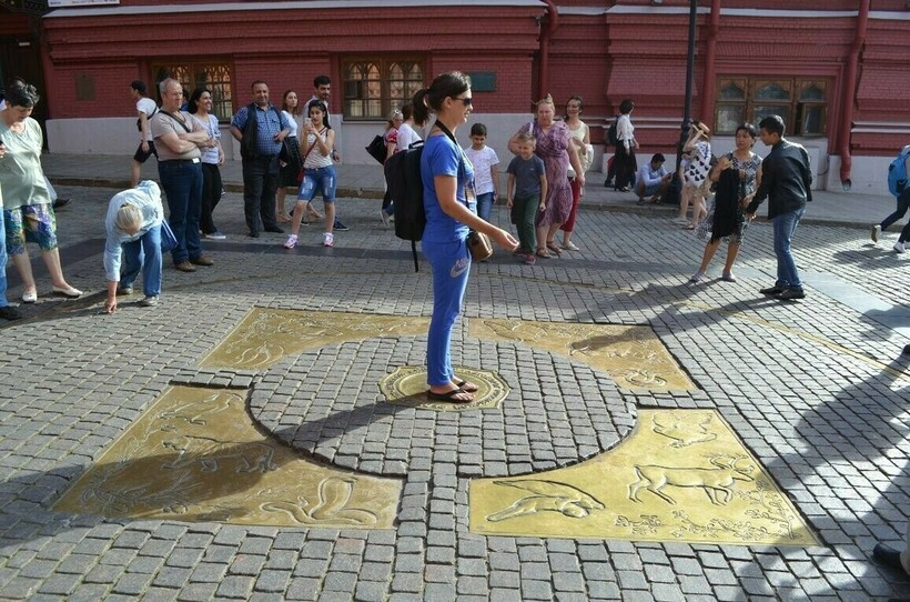 Особая отметка сделана в форме компаса, встроенного в брусчатку на Красной площади. Посередине располагается маленький круг из бронзы с розой ветров, которую на фото нулевого километра в Москве уже сложно заметить из-за сильной потертости.