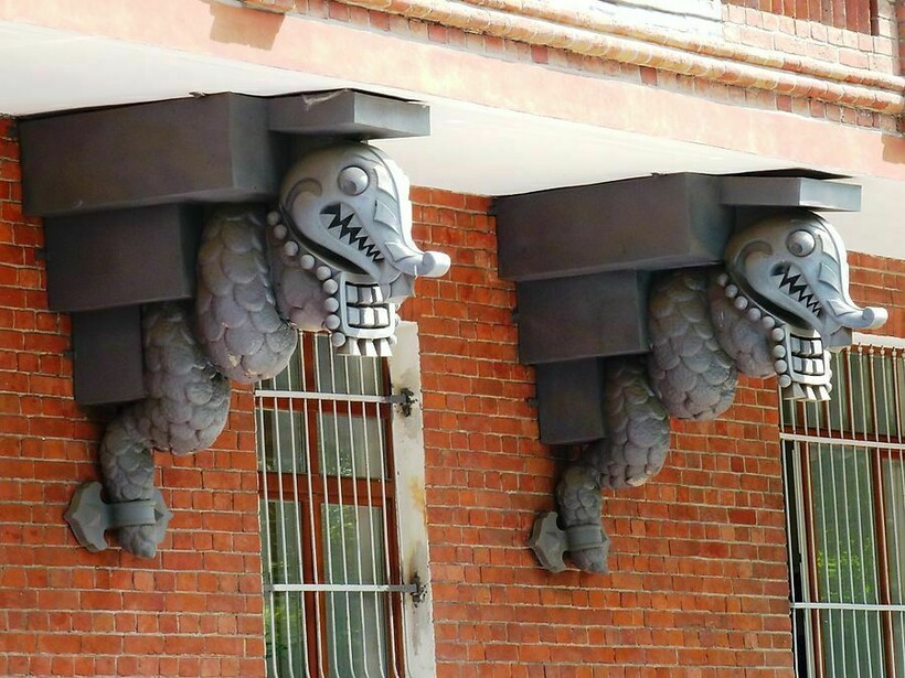 В архитектуре особняка прослеживаются мотивы славянского язычества, фасад украшен панно с изображением солнца и животных в необычном виде.