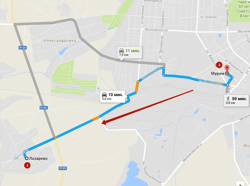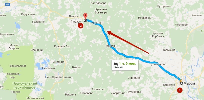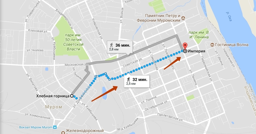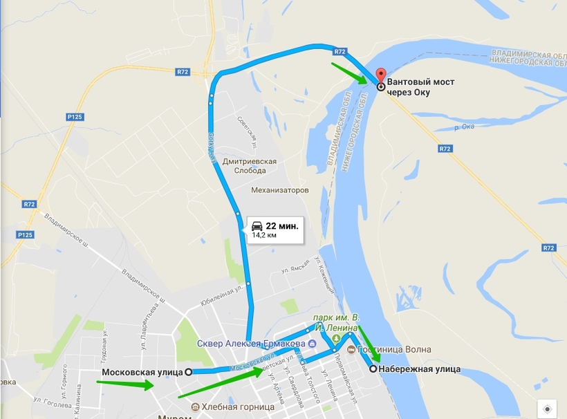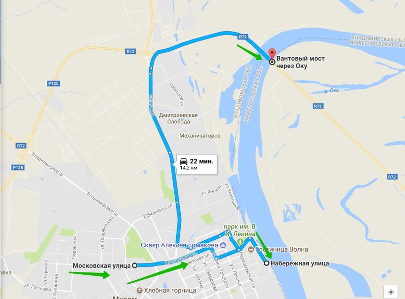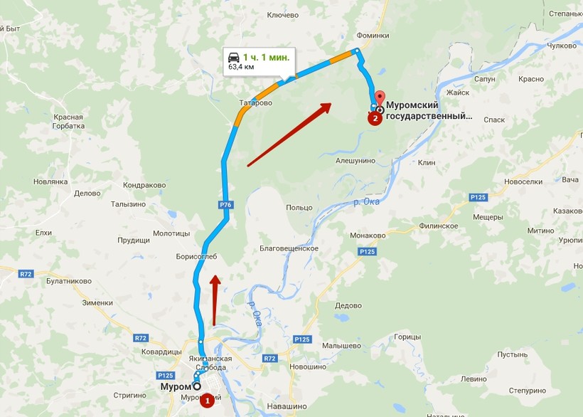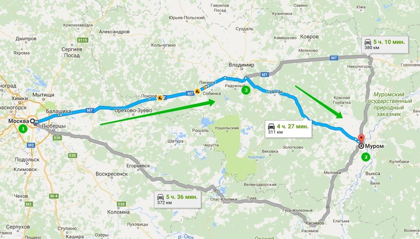 На оптимальном маршруте, подсказанном Гуглом, видим, что отделяет вас от пункта назначения всего 311 км. Очень толково весь маршрут для москвичей описан тут. Остается лишь согласиться с автором этой подсказки, что по дороге от Владимира до Мурома как-то плоховато с кафе. Я помню свой первый приезд в Муром на экскурсионном автобусе. Ехали уже в темноте, и нам с подругой казалось, что эти муромские леса никогда не закончатся. Сейчас этот отрезок дороги несколько оживлен заправками, а в 2003 году было ощущение, что ты действительно в настоящем берендеевом царстве оказался.