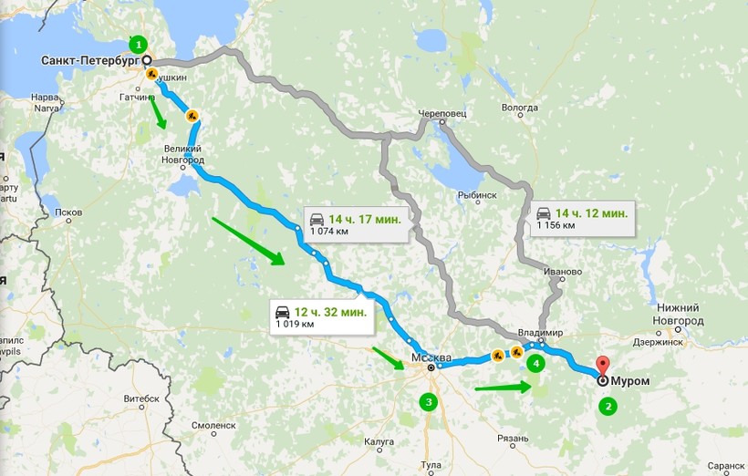Советую начинать двигаться на Москву, а не через альтернативные дороги (мимо Череповца или Тверской обл.). Процессом езды придется наслаждаться довольно долго, ибо отделяют Муром от Питера немногим более 1 000 км (см. на карте). Потому советую заблаговременно подумать, где возможно устроить необходимый отдых. Могу предложить Тверь. Во-первых, половинку пути вы уже проехали, во-вторых, почему бы не познакомиться и с этим замечательным городом? А отелей тут не мало.