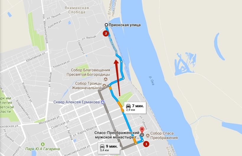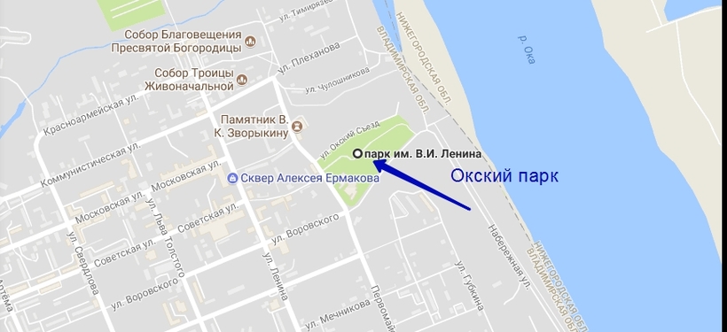 От автовокзала (1) можно минут за 10 пешком дойти до ж/д станции, а до Оки (2) минут за 30.
