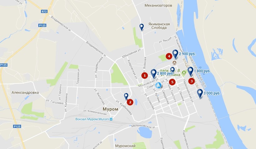 Но селиться в удаленных районах не стоит. Мы с вами будем ориентироваться на туристический центр. Тем более, что также поступает и Букинг, предлагающий гостиницы именно в этой зоне Мурома. Правда, выбор весьма невелик.