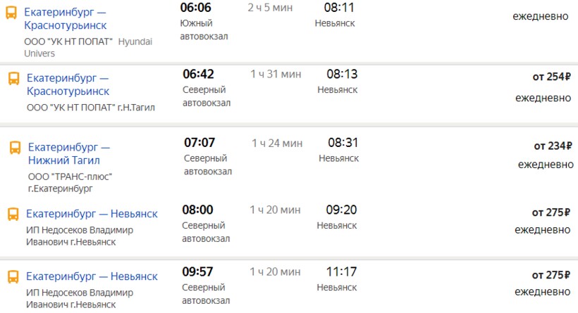 Рейсовые автобусы преодолевают расстояние из Екатеринбурга до Невьянска за 1,5–2 ч. Транспорт курсирует с 06:00 до 22:00 каждые 30–60 мин. Отправляются автобусы с Южного автовокзала (ул. 8-е Марта, 145) или Северного (ул. Вокзальная, 15а). Поездка стоит от 235 руб.