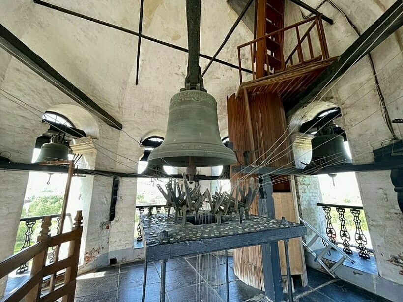 На седьмом и восьмом уровне наклонного здания находятся часы с музыкальным боем, для которых механизм и колокола были изготовлены в XVIII в. в Англии Ричардом Фелпсом.