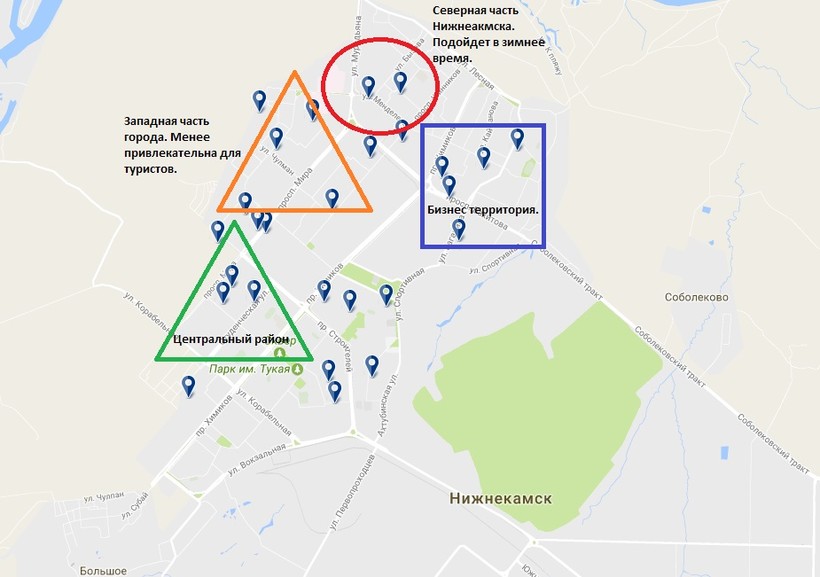 - Поэтому при выборе места ночлега выбирайте отели, отдаленные от заводов и производств. Вас не должны пугать цены — во всем городе они практически одинаковы и для приезжего человека покажутся весьма доступными. Основная часть гостиниц и апартаментов расположилась на юго-западе (на карте отмечено зеленым треугольником).К тому же данная территория находится вблизи достопримечательностей и интересных мест. Здесь же раскинулся большой сквер и парк имени Габдуллы Тукая, в котором можно подышать свежим воздухом и расслабиться после дня, наполненного эмоциями.