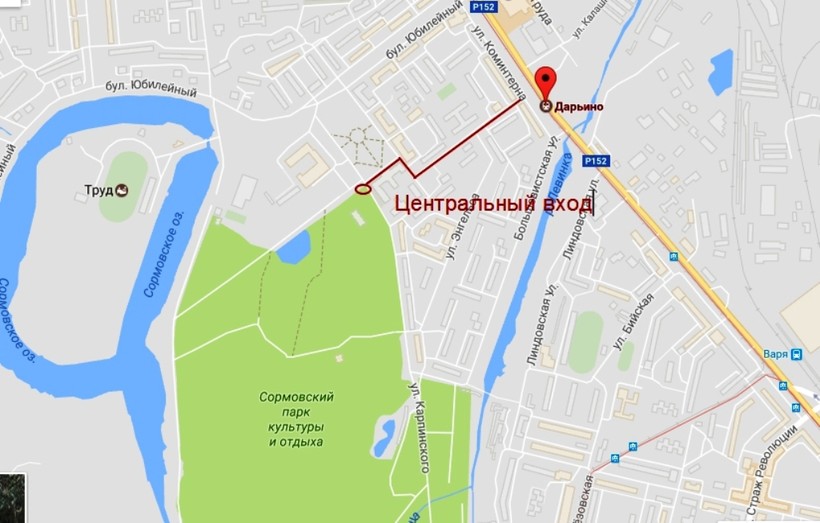 В этом разделе я расскажу, как добраться в парк на общественном транспорте и на личном автомобиле, и, где его лучше припарковать, ведь территория парка велика. Итак, начну с того, что парк находится в промышленном районе заречной части города — Сормовском районе, между улиц Коминтерна, Ярошенко и бульваром Юбилейный. Если посмотреть на карте, то можно увидеть, как эти улицы как бы окольцовывают его.