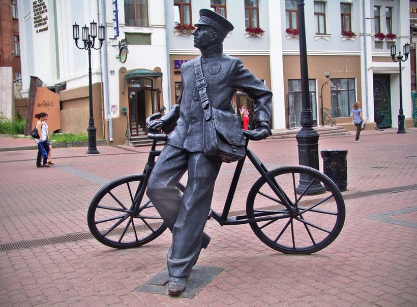 - А на противоположной стороне — памятник Почтальону, открытый сравнительно недавно, в 2006 году.