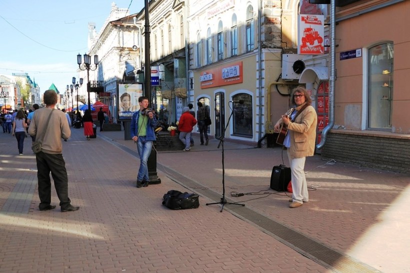 - Неспешно прогуливаясь дальше, впереди вы найдете магазины обуви, одежды, отделы с ювелирными украшениями, швейцарскими часами, и, конечно же, множество кафешек, о лучших из которых я расскажу ниже. Приближаясь к Кремлю, вы не пройдете мимо Государственного драматического театра и Театральной площади, на которой в основном и выступают уличные артисты, прося поддержать их начинание небольшой монеткой.