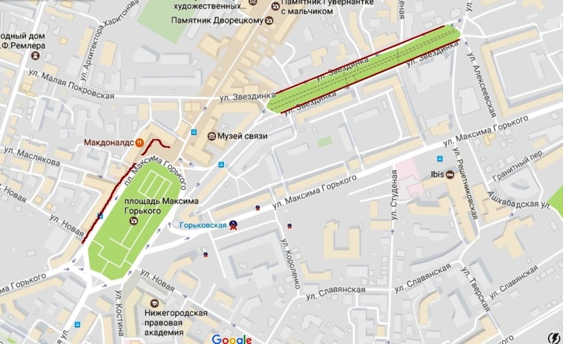 Так как «Покровка» находится в самом сердце Нижнего Новгорода, добраться до нее не составит большого труда. Практически весь наземный транспорт города так или иначе останавливается рядом с этой улицей. Вашу прогулку стоит начать либо с площади Горького, либо Минина и Пожарского, между которыми и находится Большая Покровская. Лично я предпочитаю выходить на остановке «Площадь Горького», так я могу насладится неспешной прогулкой по пешеходной улице, а напоследок пройтись по