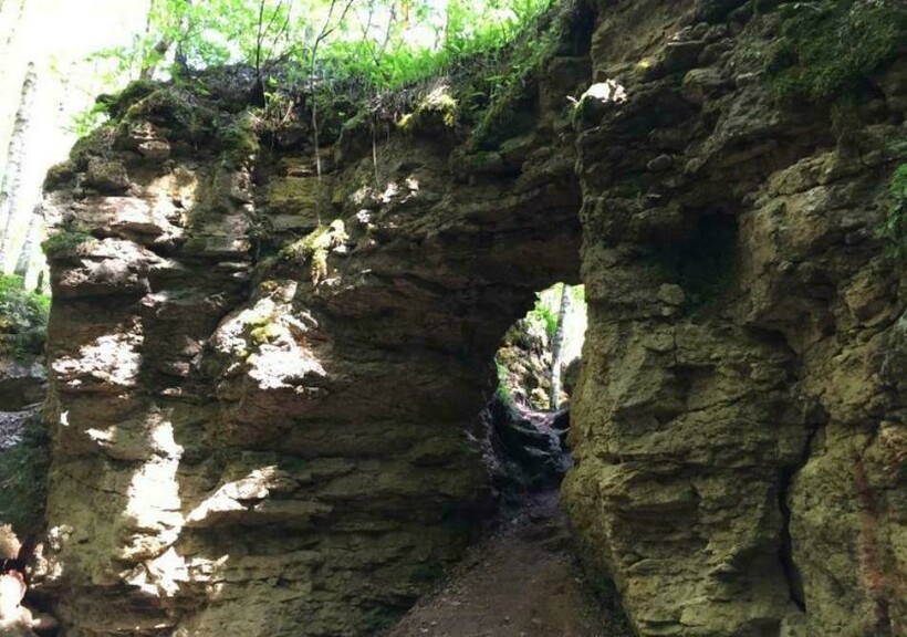 На выходе из оврага вы увидите Чертов мост. Каменная известняковая арка удивляет туристов своими причудливыми очертаниями. Под сводами арки проложена тропинка, лезть наверх по разрушенным скалам не рекомендуется.