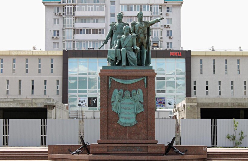 В скульптурной группе генерал Раевский указывает путь дальнейших завоеваний России. Адмирал Серебряков сидит, олицетворяя незыблемость российской власти.