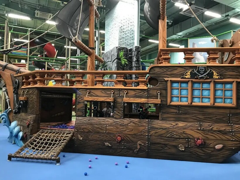 - активити-парк с горками, лабиринтами, батутами и пиратским кораблем;
