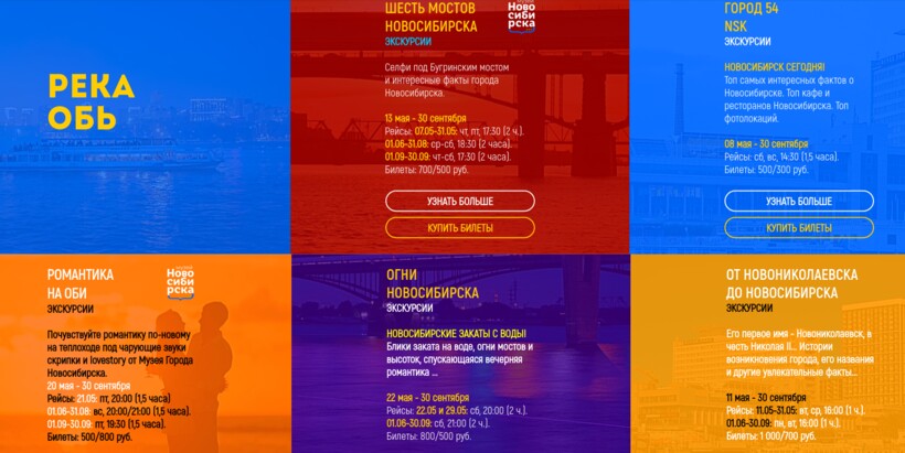 - «Огни Новосибирска» — экскурсия по вечернему городу, красотой которого наслаждаются туристы с палубы теплохода. Выезды по субботам в мае в 20:00, в июне — сентябре — в 21:00.