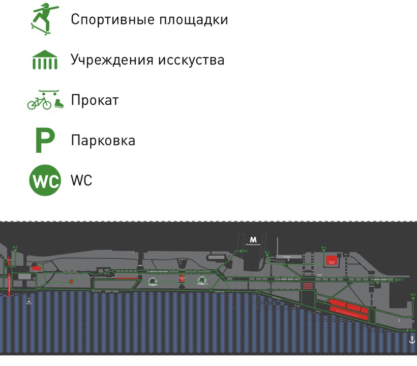 В кассах речного вокзала можно взять билеты на прогулку по Оби. Также работает большой парк аттракционов. Для детей оборудовано несколько игровых зон, для любителей спорта на верхнем уровне променада построена спортивная площадка с тренажерами.