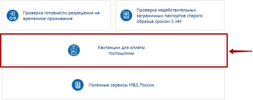 - На главной странице сервиса выберите «Квитанции для оплаты пошлины».