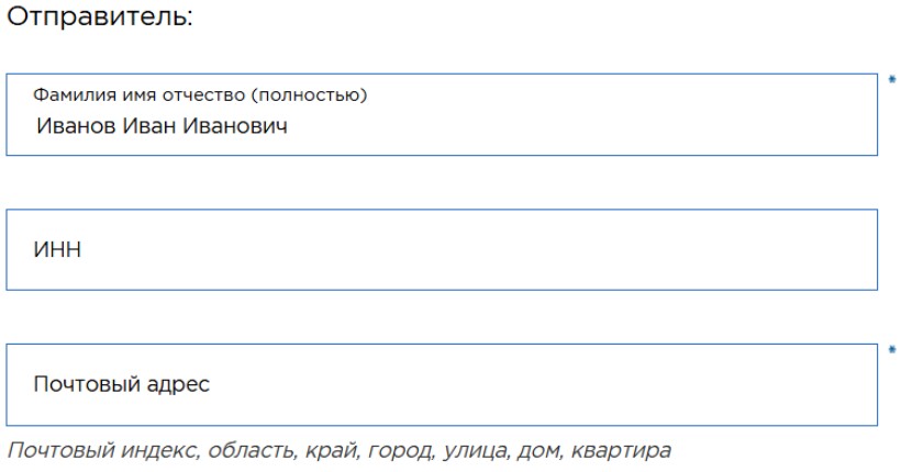 - В разделе «Отправитель» внесите личные данные заявителя.