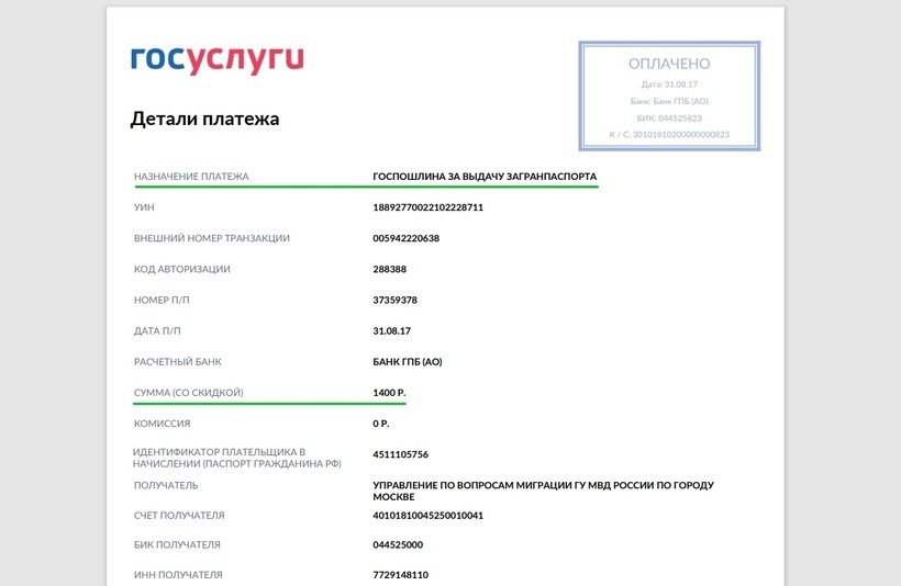 Напомним, что дистанционная оплата за загранпаспорт через Госуслуги — быстрый и выгодный современный способ, благодаря существенному снижению цены на госуслуги, но это далеко не единственный вариант. Без скидки 30 % оплатить госпошлину можно в отделении местного МФЦ или через банк, скачав квитанцию на сайте МВД. В бланк необходимо правильно вписать реквизиты местного отделения ГУМВД, в которое планируете подавать заявку, а также указать наименование и код платежа, соответствующие вашему запросу.