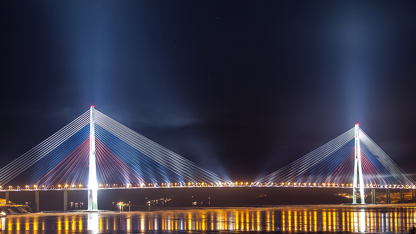 Попытки связать остров с материком предпринимались начиная с 1939 года, но окончательное решение о строительстве было принято лишь в 2007 году. Впервые увидев мост, я поняла, что настолько серьезный проект могли воплотить только в наши дни. Ванты моста, ведущего на остров Русский от Владивостока, выкрашены в цвета российского флага, в темное время суток включается подсветка. Пешеходная зона на мосту не предусмотрена, зато отличный вид открывается с набережной кампуса ДВФУ.