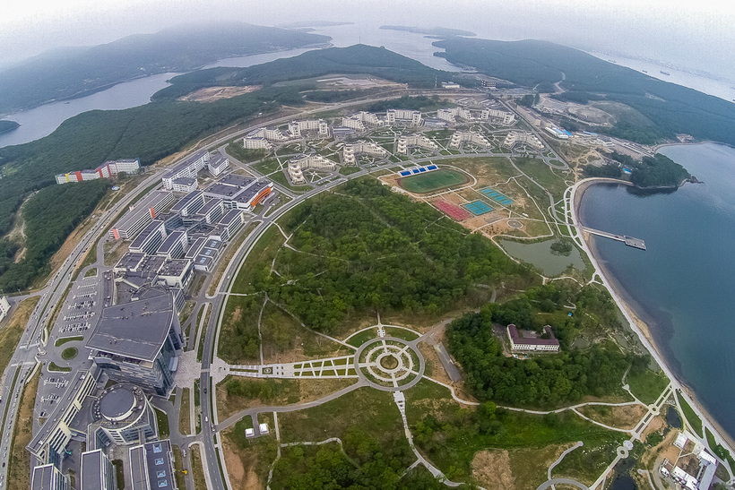 ДВФУ – крупнейший институт Владивостока, расположенный на Русском острове. Студенческий кампус, построен в поселке Аякс и выглядит светлым и гостеприимным. Сначала он показался мне дорогим жилым районом, где из окон домов видно море, повсюду возвышаются многоуровневые парковки, а дорожки прямиком от подъезда ведут к песчаному пляжу. В центре всего этого великолепия красуется огромный ухоженный парк.
