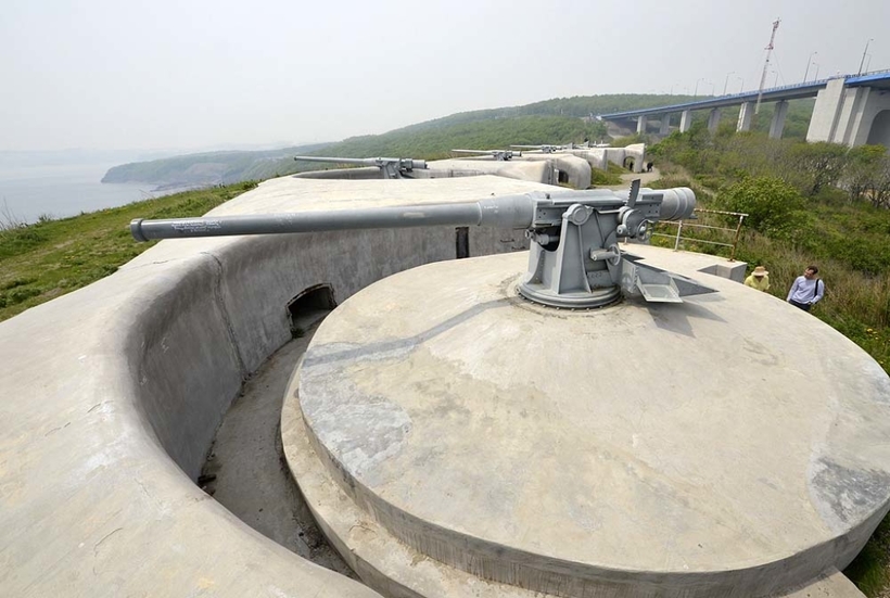 - После моста сворачиваем в сторону поселка Поспелова и, не доезжая до него, снова поворачиваем направо. Огибаем населенный пункт по кругу и едем вдоль линии воды до тех пор, пока не увидим восемь свежеотреставрированных пушек, направленных в море. Перед нами Новосильцевская батарея. Делаем красивые фото открывшегося вида на бухту, Русский мост, город Владивосток и едем дальше.