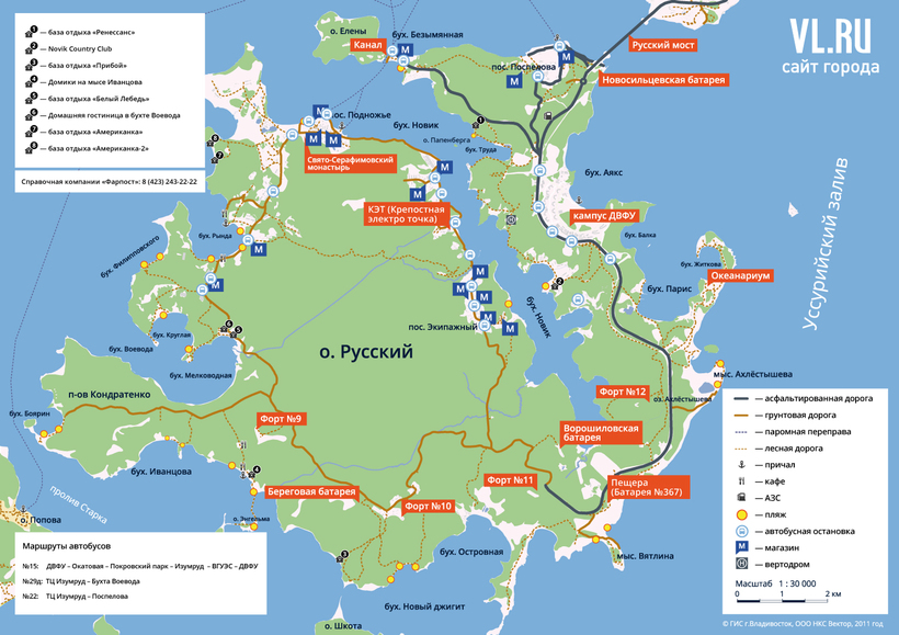 Автобус – самый удобный вид транспорта для того, чтобы попасть на остров из Владивостока. С окончанием строительства моста на Русский были запущены регулярные маршруты. Из центра сюда можно добраться на автобусах №63 (следует по маршруту от остановки "Маяк" через центр города до поселка Аякс) и №22Д (От ТЦ Изумруд до поселка Аякс). Стоимость проезда на городском автобусе – 20 рублей.