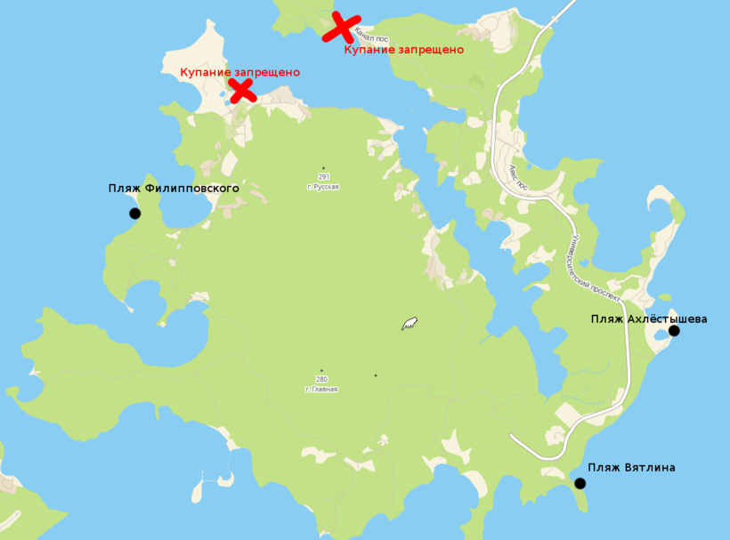 В отличие от города, купаться на Русском можно почти везде. Вода здесь считается чистой. Пляжи есть возле каждой базы отдыха. Как правило, они оборудованы всем необходимым. Въезд на машине стоит 100–200 рублей за парковочное место, пешком заходить можно бесплатно.