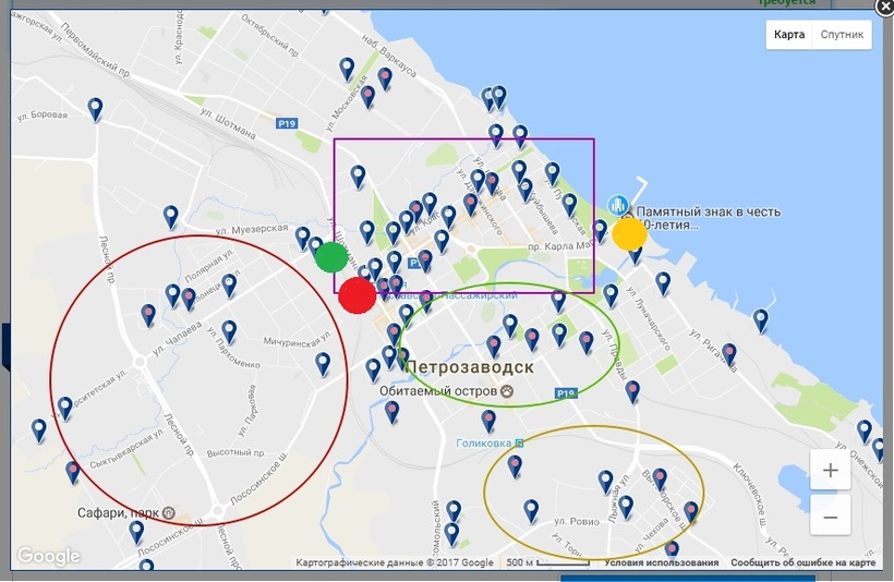 - Центр (на карте прямоугольник фиолетового цвета; красная, зеленая, оранжевая отметки — Ж/д, Автобусный, Водный вокзалы, соответственно). Ограничен ул. Ленинградской с севера, берегом Онеги с востока, рекой Лососинкой с юга и улицей Шотмана с запада. Логично, что большинство туристов выбирают для проживания Центральный район города. Это объясняется близостью вокзалов, наличием развитой инфраструктуры, да и цены на проживание в гостиницах мало чем отличаются от цен на отели в других частях города. Есть различные варианты размещения — гостиницы, хостелы, апартаменты. В принципе, за 1 500 рублей можно снять либо двухместный номер в приличном отеле, либо однокомнатную квартиру-апартаменты. Где можно сравнить цены и как забронировать жильё, я расскажу в следующем разделе.