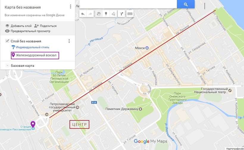 Вокзал отмечен на карте фиолетовым значком и расположен в самом Центре столицы Карелии. Так что вам будет удобно сразу начать знакомство с городом.