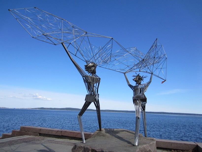 Пожалуй, этот памятник первым бросился мне в глаза еще издалека, когда я только подходила к набережной. Стальная скульптура «Рыбаки», подаренная городу американским Дулутом штата Миннесота, в свое время открыла оригинальный музей под открытым небом. Сложно сразу понять, какая идея пришла в голову автору монумента, талантливому скульптору Рафаэлю Консуэгра, и легла в основу этой композиции.