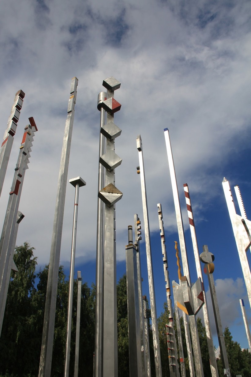 Тюбингенское панно Петрозаводску подарили немецкие скульпторы. Эта композиция состоит из закрепленных в земле металлических столбиков. Всего их я насчитала 61. Столбики имеют отличную друг от друга форму и высоту, они окрашены в разные цвета, а в их вершины вмонтированы взятые из исторических мест республики Карелия и города Тюбингена камни.