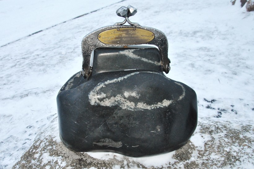 Этот довольно интересный и чудной памятник подарен Петрозаводску сотрудниками латвийской строительно-проектной компании. Создатель композиции – Айварс Керлиньш, художник из Риги. Однажды он нашел камень, напомнивший ему своей формой старинный кошелек, который набит деньгами.