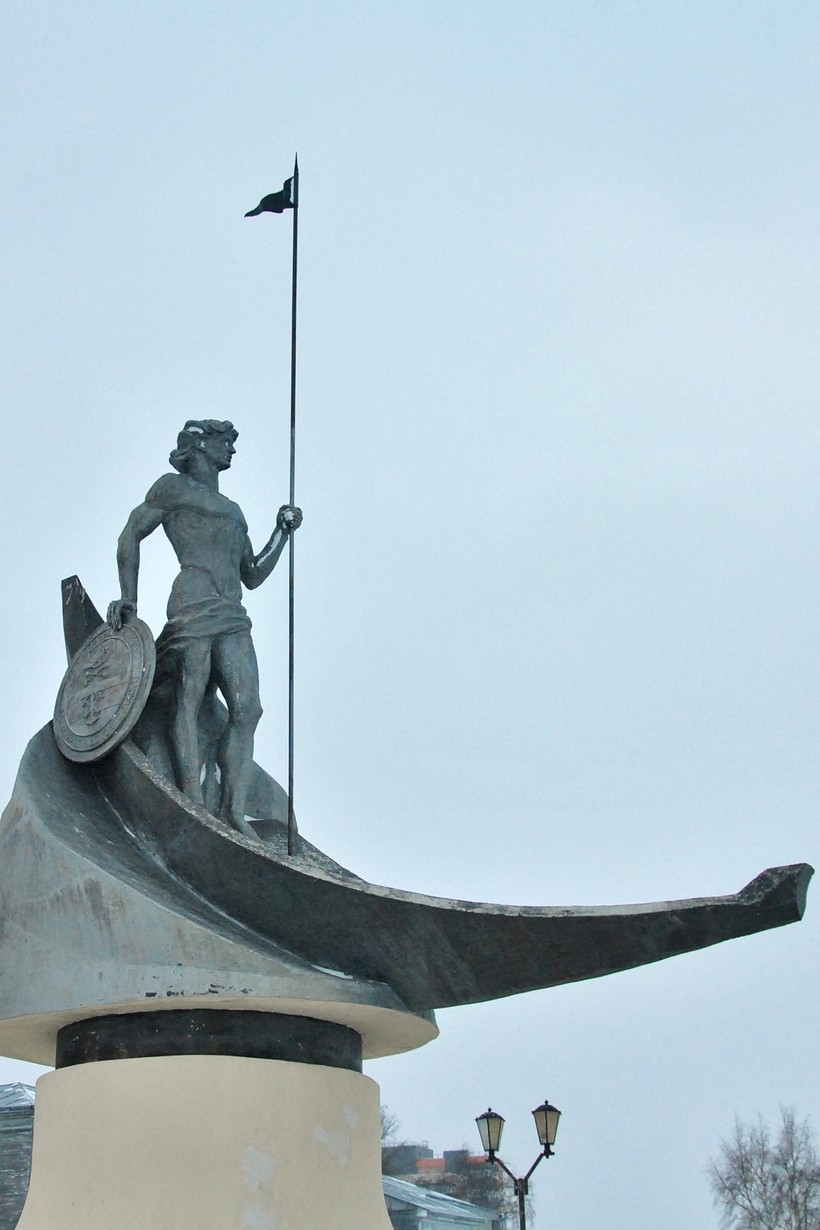 Юный воин стоит в лодке и готовится к выходу на берег. В одной руке он гордо сжимает копье, другая же опирается на крепкий щит. На щите том можно увидеть герб города Петрозаводска, а рядом с ним надпись: «Петрозаводск 1703-2003. Дар Ленинградской области». Пожалуй, это один из самых величественных памятников на набережной Онежского озера! Его высота с постаментом составляет 11,5 метров, а высота фигуры воина отдельно – 7,5 метров.